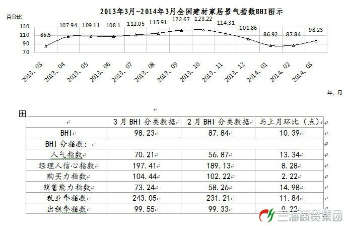由商務部流通業發展司、中國建筑材料流通協會共同發布的全國建材家居景氣指數BHI3月份全國建材家居景氣指數(BHI)為98.23,環比上升10.39點,同比上升12.73點。全國規模以上建材家居賣場3月銷售額為807億元,環比上升26.15%,同比上升11.18%。1-3月累計銷售額為2180億元,同比上升2.07%。